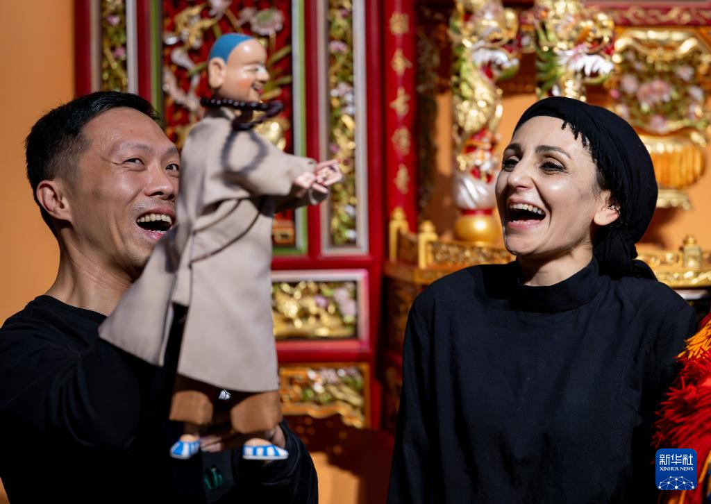 在福建泉州晋江市掌中木偶艺术保护传承中心,法希玛·巴罗奇与晋江市掌中木偶艺术保护传承中心演出队队长、市级非遗传承人陈代宫一见如故,两名中外艺术家台上台下交流互鉴,相互学习表演技艺。