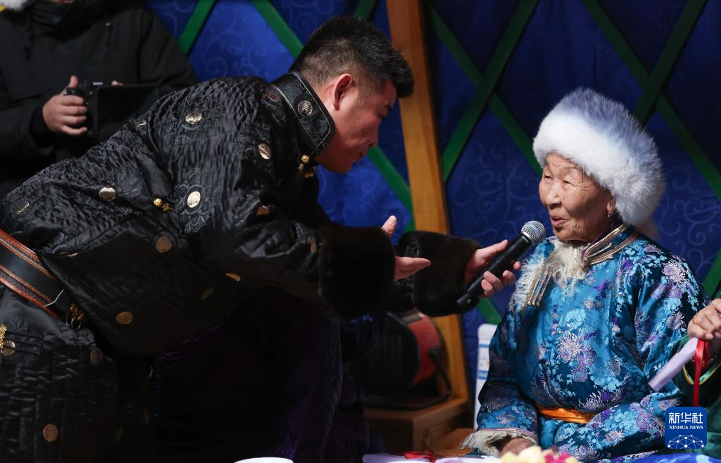 12月21日,乌兰牧骑队员在阿其图乌拉苏木演出过程中和牧民互动。