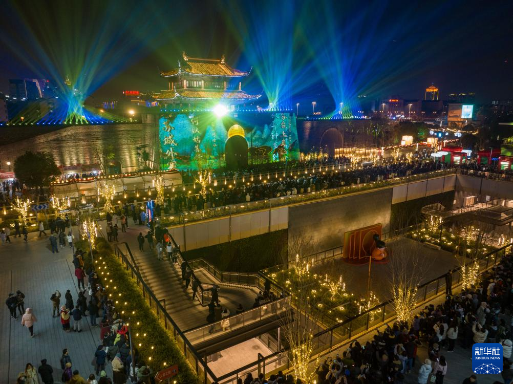12月24日,市民在观看相门古城墙灯光秀(无人机照片)。
