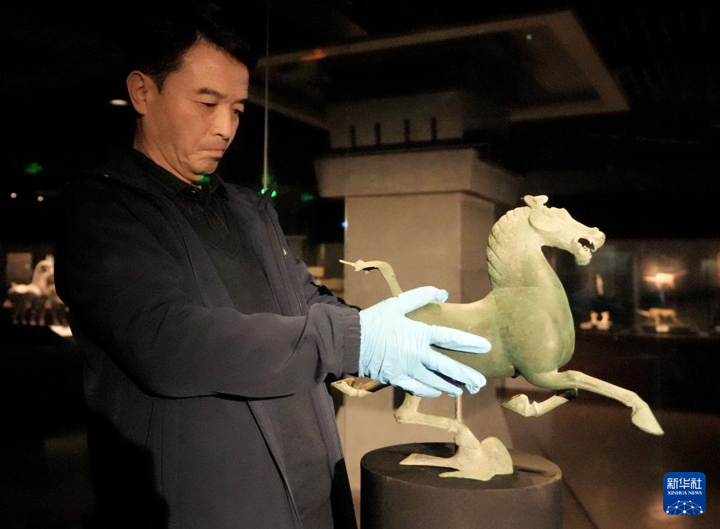 工作人员在甘肃省博物馆展厅内安放铜奔马(2023年10月27日摄)。