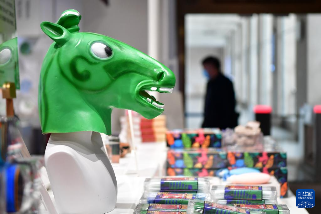 在甘肃省博物馆文创商店拍摄的以铜奔马为主题设计的“绿马头套”(2022年5月13日摄)。
