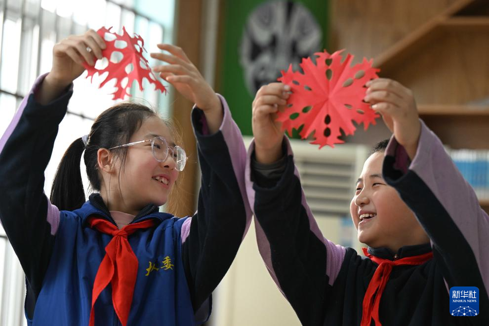 1月15日,河北省石家庄市裕华西路小学的学生在校园庙会活动中展示自己剪的窗花。