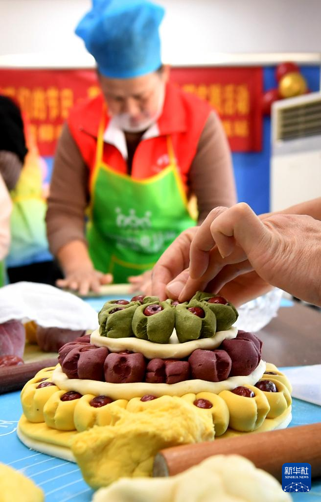 1月15日,在山东省青岛市市南区湛山街道仰口路社区,居民在制作枣饽饽。