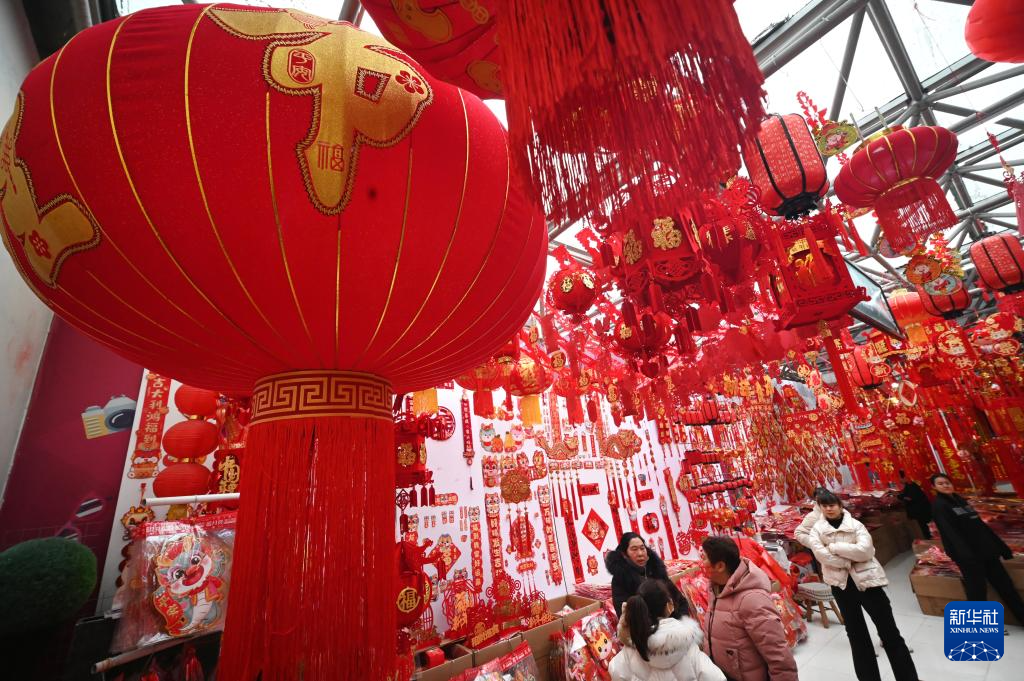 1月19日,人们在河南省开封市年货批发市场选购春节饰品。