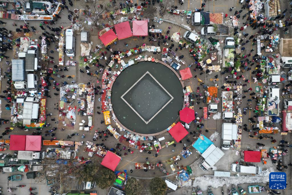 1月20日,人们在山东省济南市二七新村南路附近的山水大集上选购年货(无人机照片)。