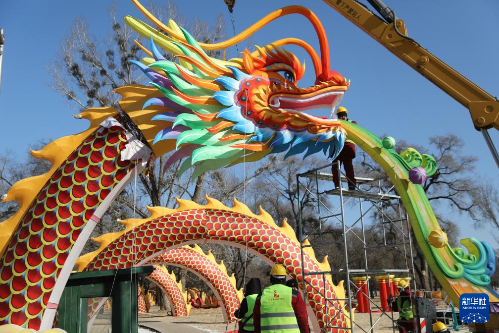 1月21日,在河北承德避暑山庄万树园景区,工人在组装龙型花灯。