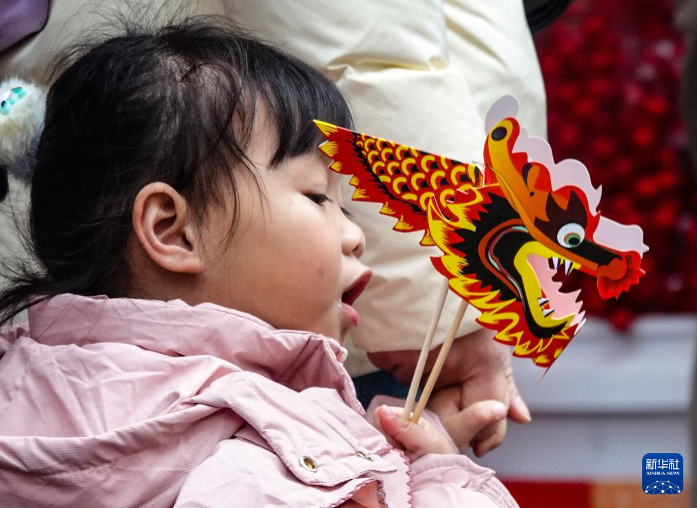 1月21日,在广西南宁市上海路年货市场,一名小女孩拿着刚买的玩具龙玩耍。