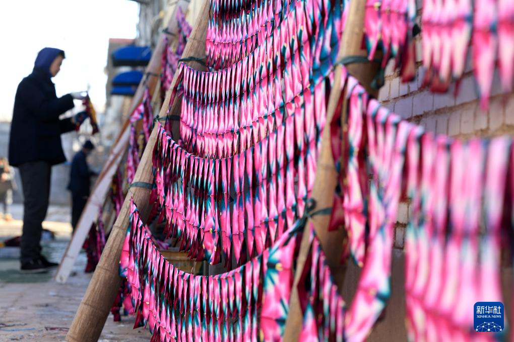 1月24日,在石家庄市栾城区邵家庄村,手工艺人在晾晒彩子。