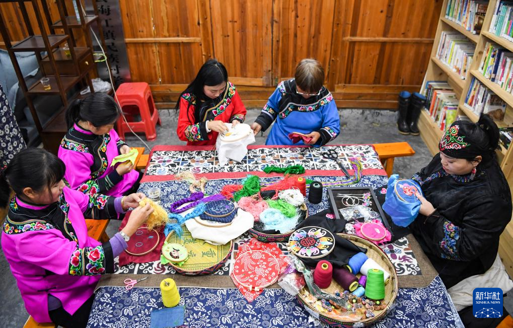 1月23日,在秀山县梅江镇民族村,杨秀燕(右一)和绣娘一起刺绣。