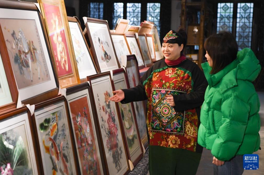 1月24日,在位于秀山县的金珠苗绣传承馆,杨秀燕(左)向参观者介绍苗绣作品。