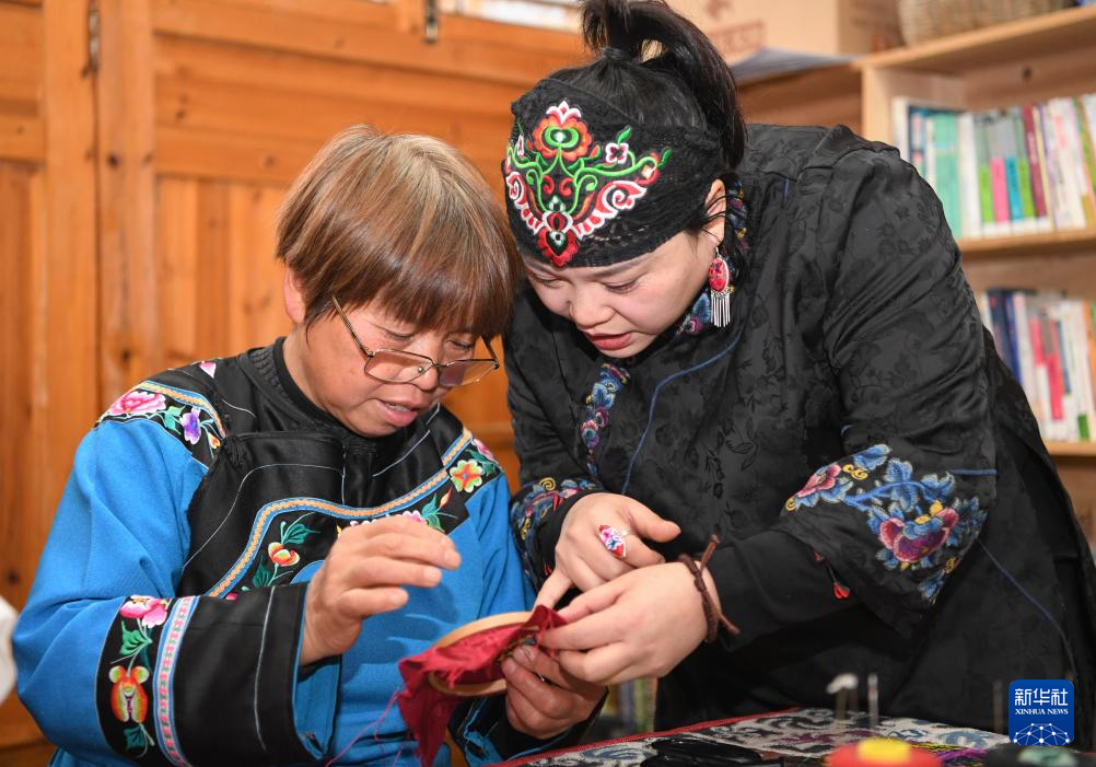 1月23日,在秀山县梅江镇民族村,杨秀燕(右)和绣娘交流刺绣技巧。