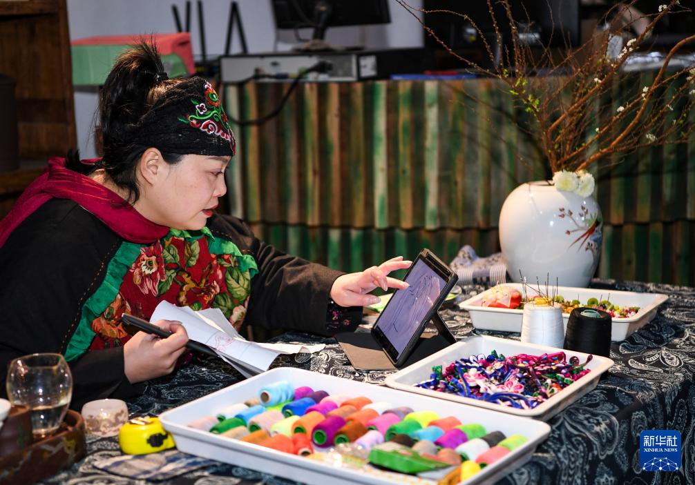 1月24日,杨秀燕在位于秀山县的金珠苗绣传承馆构思苗绣作品设计。