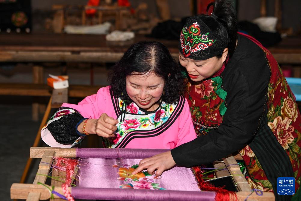 1月24日,在位于秀山县的金珠苗绣传承馆,杨秀燕(右)和绣娘交流刺绣技巧。