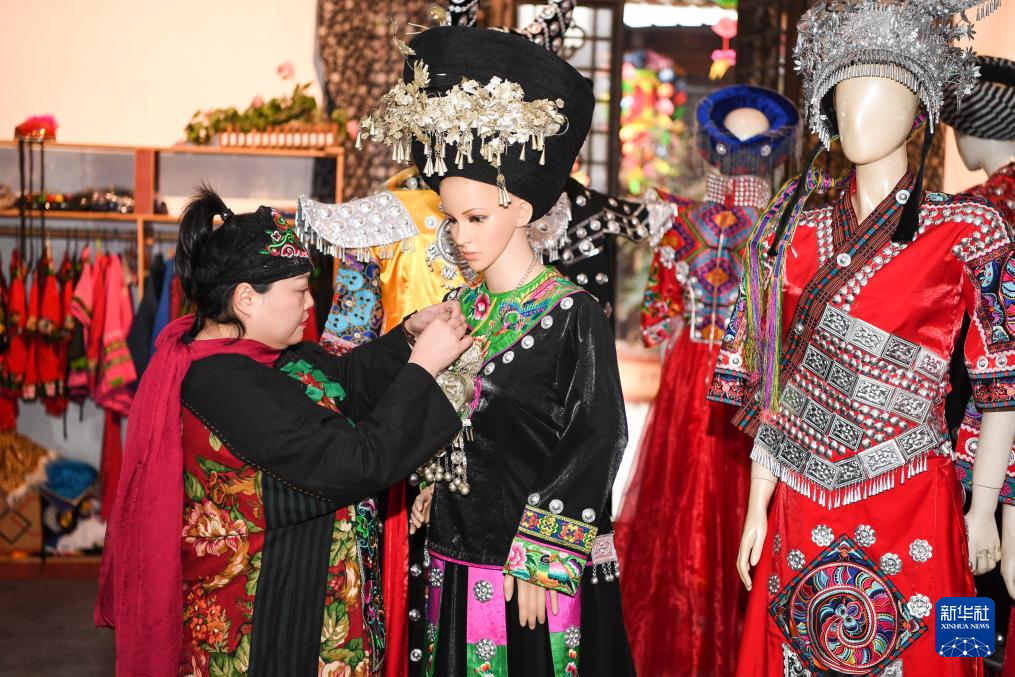 1月24日,杨秀燕在位于秀山县的金珠苗绣传承馆整理苗族服饰产品。