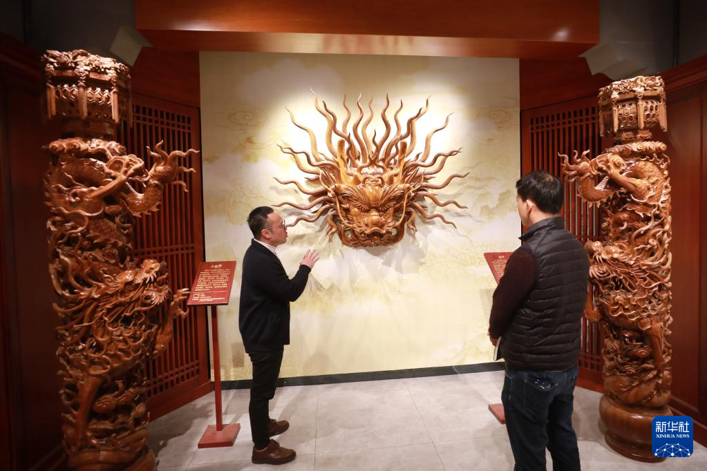 1月27日,晋江市东石镇潘山村晋江市艺达古建筑工程有限公司总经理郑挺进向参观者介绍龙柱、龙头木雕展品。