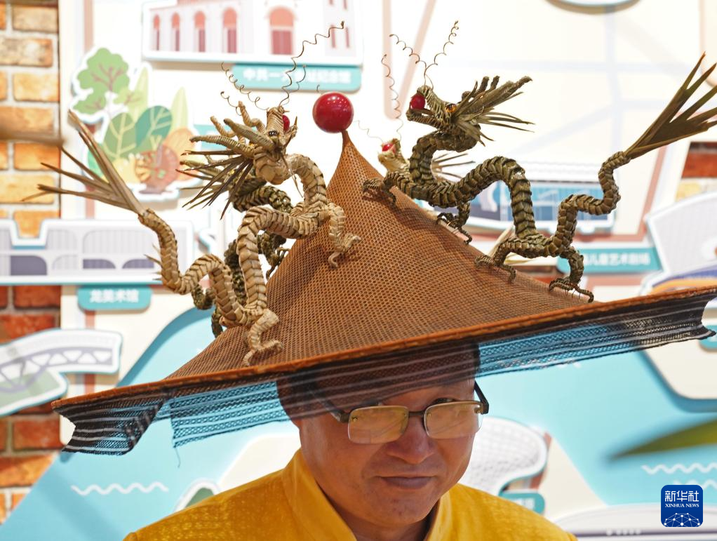 1月28日,在年俗主题市集上,一名棕编非遗技艺传承人展示迎龙年主题的造型帽子。