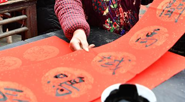 2月3日,家长和孩子们在浙江自然博物院杭州馆写“福”字。
