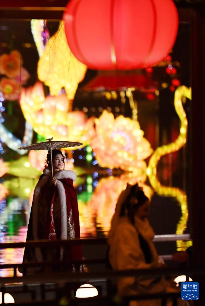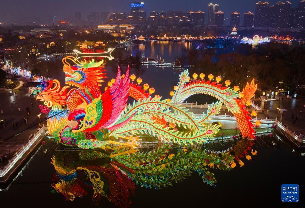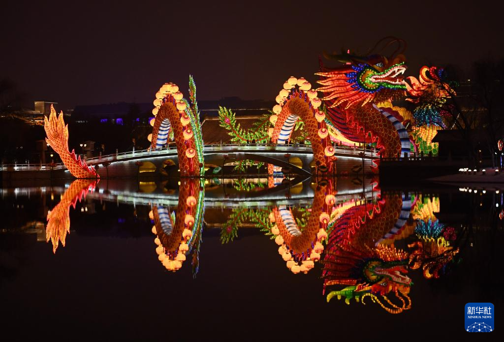 2月2日,龙形花灯在西安大唐芙蓉园点亮。