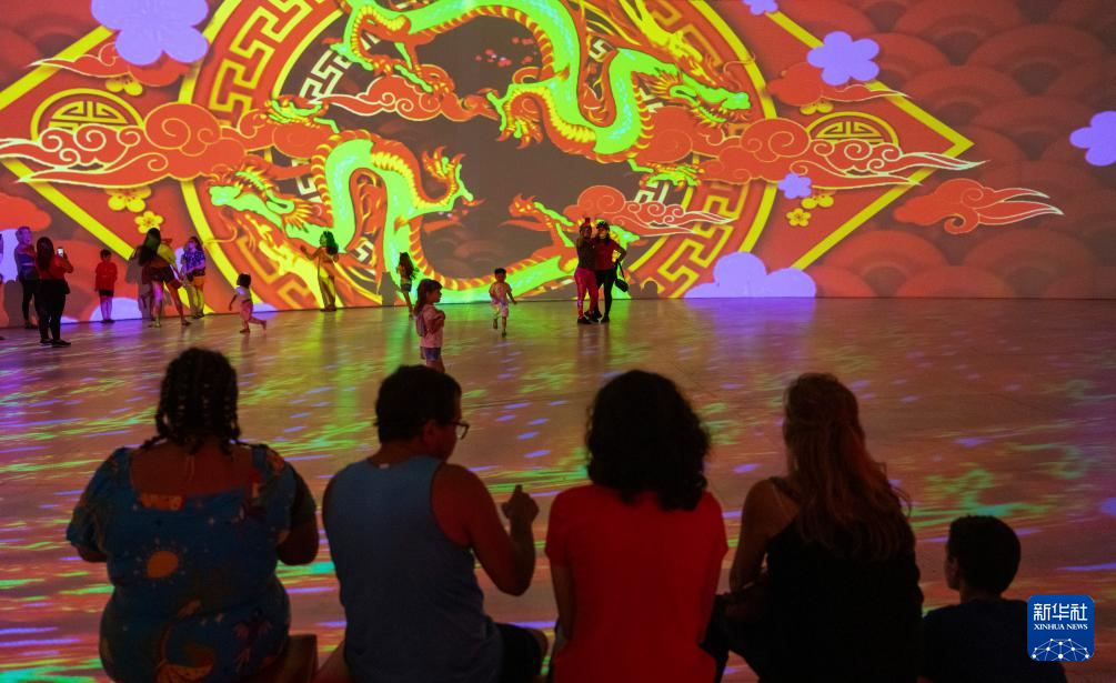 2月3日,在巴西累西腓,人们在中国春节庆祝活动上观赏沉浸式体验展。