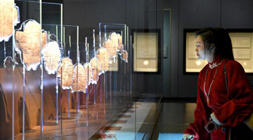 2月26日,参观者在河南安阳殷墟博物馆新馆内观看展出的刻辞卜甲。