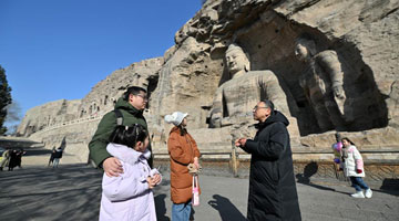 杭侃(右)在给游客讲解云冈石窟的历史知识(2月25日摄)。
