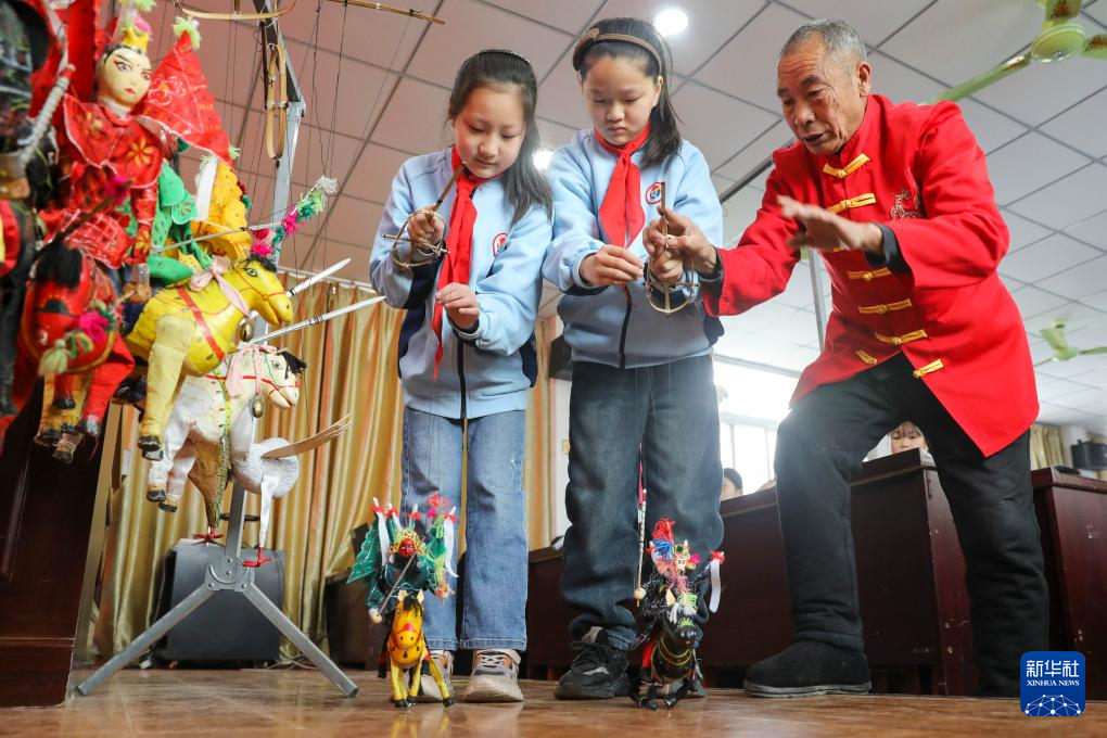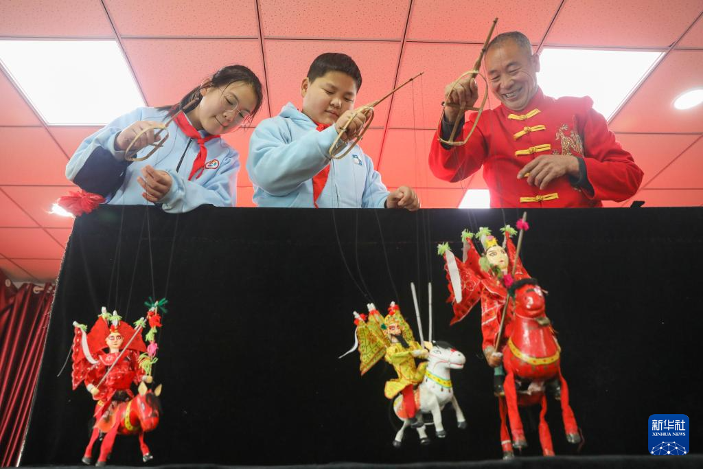 3月7日,河南省宝丰县山河路小学的学生在学习提线木偶戏表演。