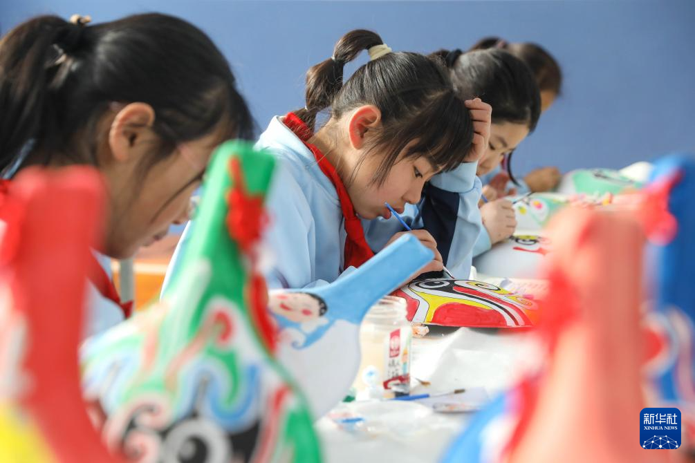 3月7日,河南省宝丰县山河路小学的学生在绘制马勺脸谱。