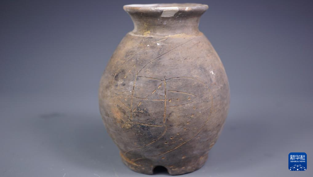 图为磨盘山遗址出土的崧泽文化时期带有图画刻划的壶。