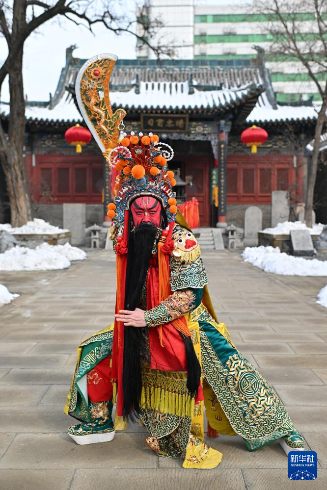 在太原大关帝庙,到此练习的晋剧非遗代表性传承人武凌云披挂戏装,一手持青龙偃月刀,一手掠须,威风凛凛,举手投足间显现关公风范。