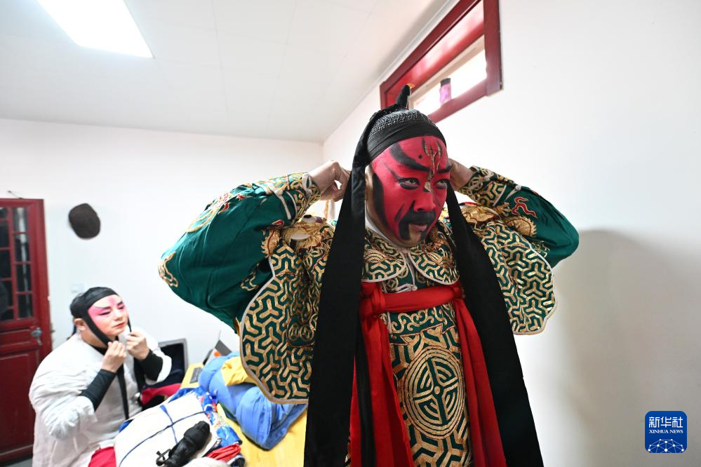 在太原市迎泽区,武凌云为上台演出做准备(2月2日摄)。