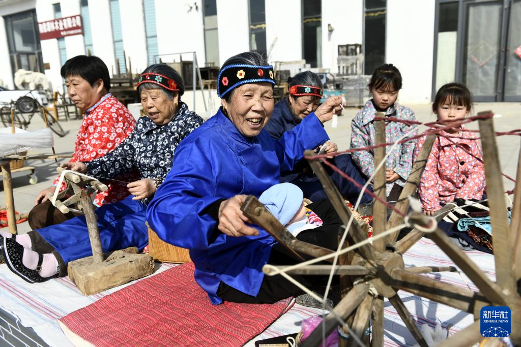 4月4日,水落坡镇乡村社火队队员在演绎鲁北乡村的传统纺线场景。
