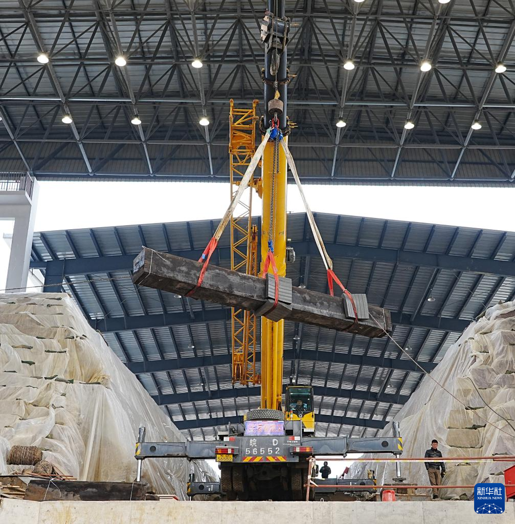 考古工作者对安徽淮南武王墩主墓椁顶盖板进行吊装作业(2024年4月14日摄)。