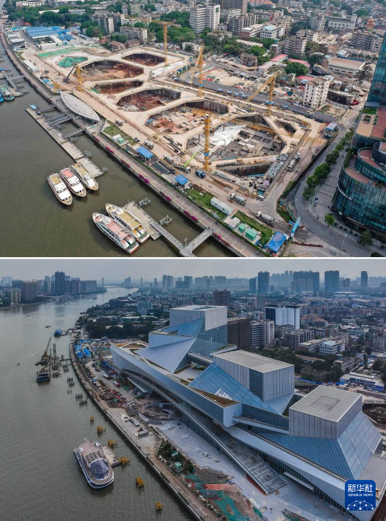 拼版照片:上图为基坑施工阶段的白鹅潭大湾区艺术中心(新华社发,2021年3月26日摄);下图为即将竣工的白鹅潭大湾区艺术中心(新华社记者刘大伟2023年12月27日摄)。