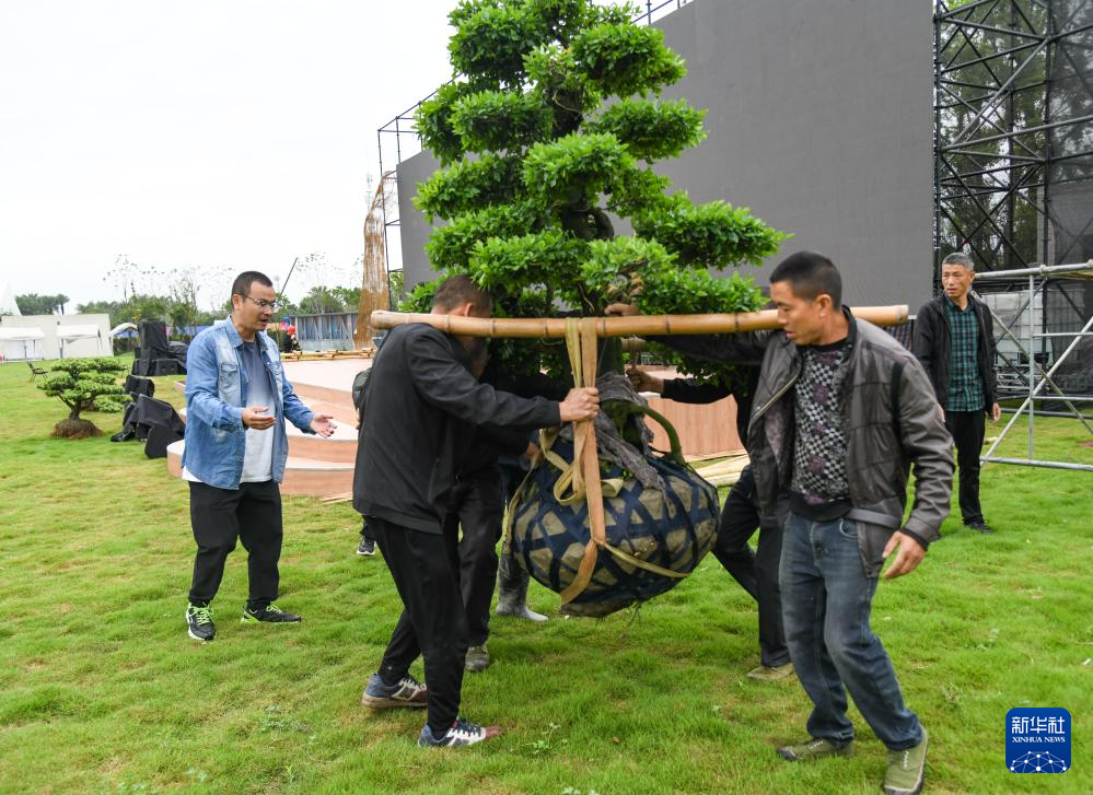 4月23日,在成都世园会温江分会场,陈宏宇(左一)指挥工人搬运用于装饰主舞台的大型盆景。
