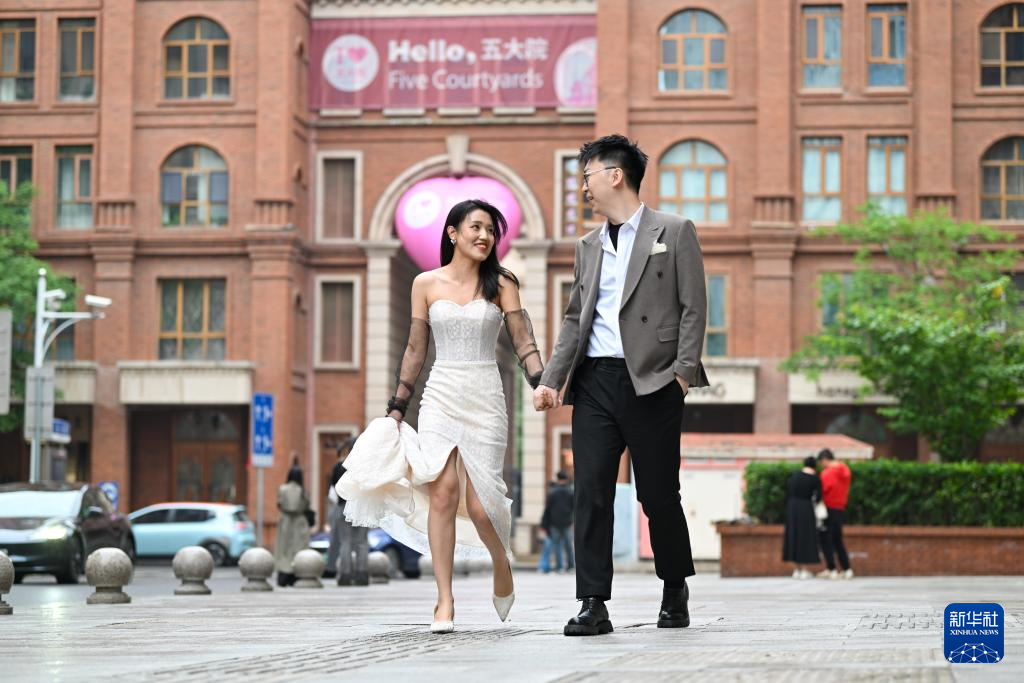 一对恋人携手走在天津解放北路历史文化街区内(5月5日摄)。