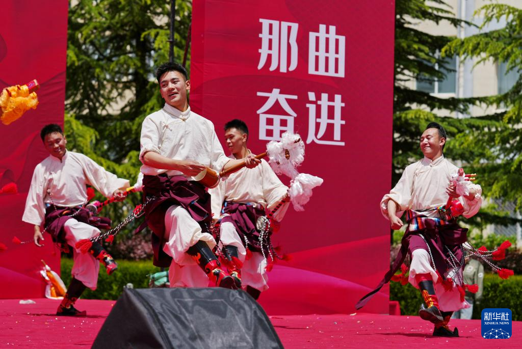 5月12日,在西藏职业技术学院职业教育活动周启动仪式暨比如县非物质文化遗产进校园活动上,比如县民族艺术团的演职人员在表演节目。