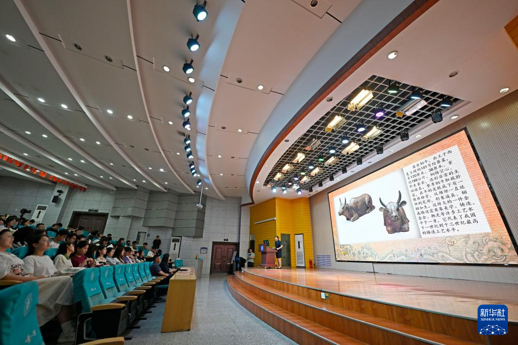 宁夏博物馆讲解员在宁夏医科大学为学生讲解文物知识(5月14日摄)。