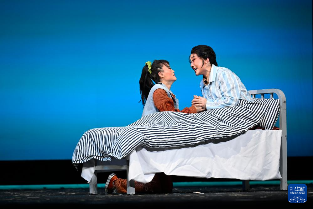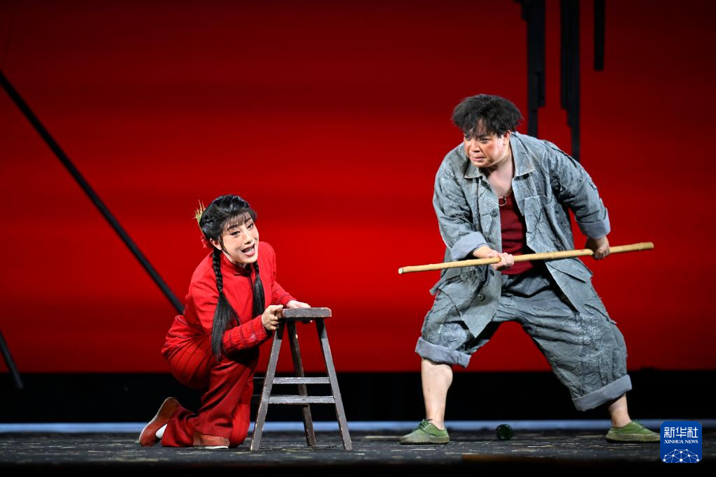 5月15日晚,在宁夏人民剧院,饰演李水河的侯艳(右)与饰演马阳阳的吴冰(左)在《攒劲女人》中表演。