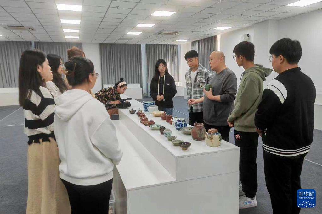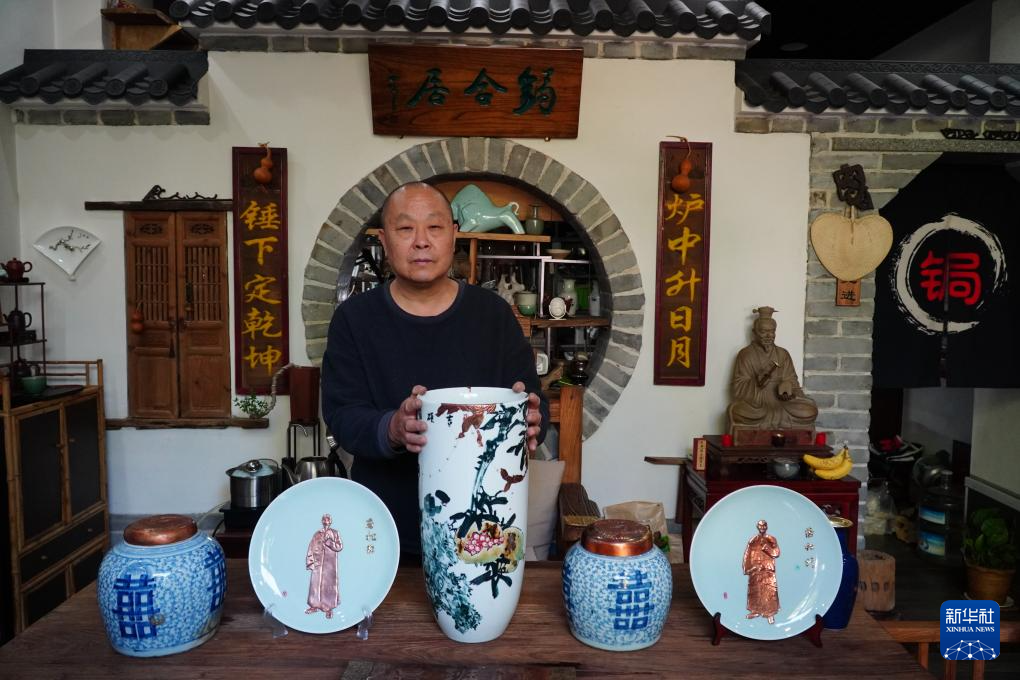 杨涛在工作室展示锔瓷修复的瓷器(5月8日摄)。