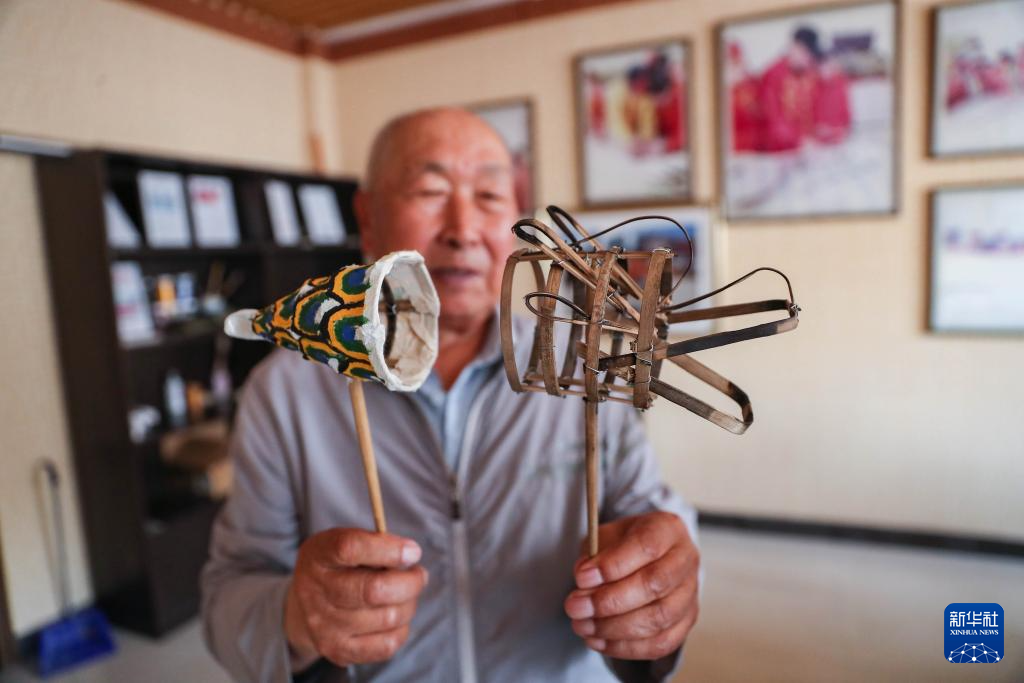 6月4日,张仲发的侄子张新吉(前)在位于沈阳市沈北新区虎石台街道的非遗工作室中学习舞龙头。