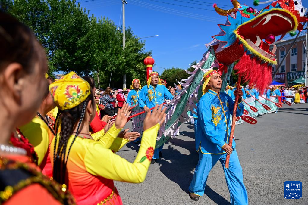 6月4日,在甘河子镇“千人共跳民族舞”主题活动现场,参演单位在进行社火舞龙表演。