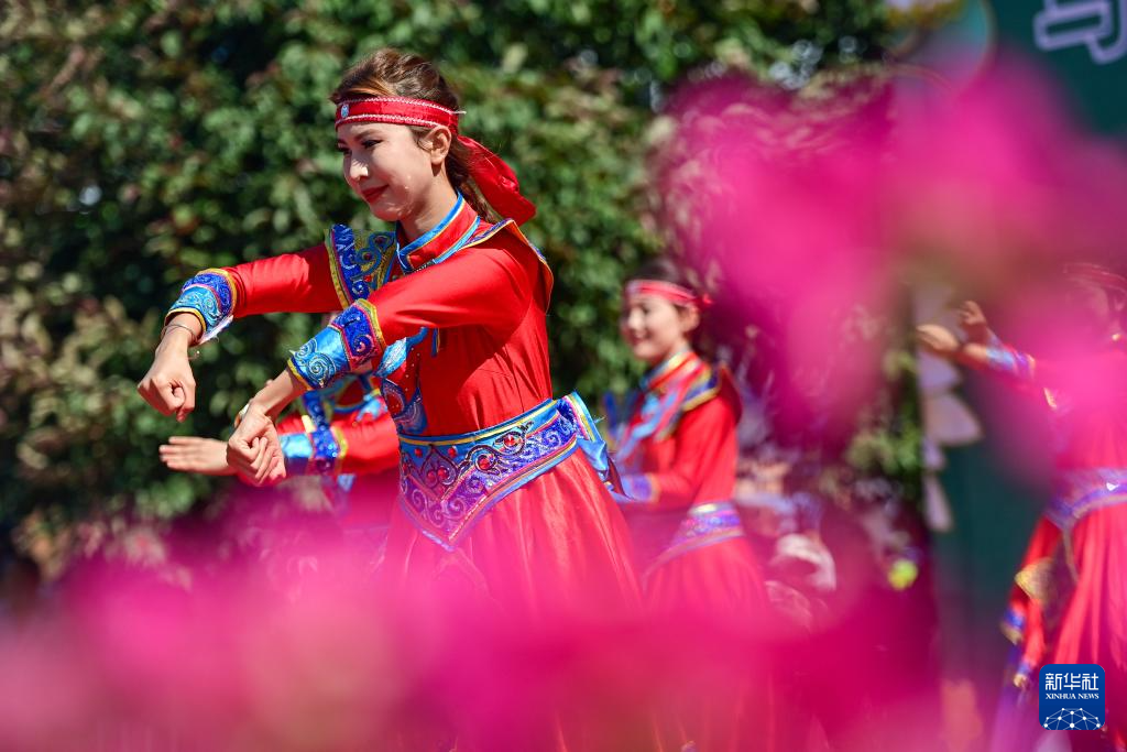 6月4日,在甘河子镇“千人共跳民族舞”主题活动现场,新疆应用职业技术学院学生在表演蒙古舞。