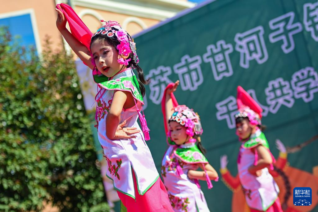 6月4日,在“千人共跳民族舞”主题活动现场,甘河子镇中心小学学生在表演节目。