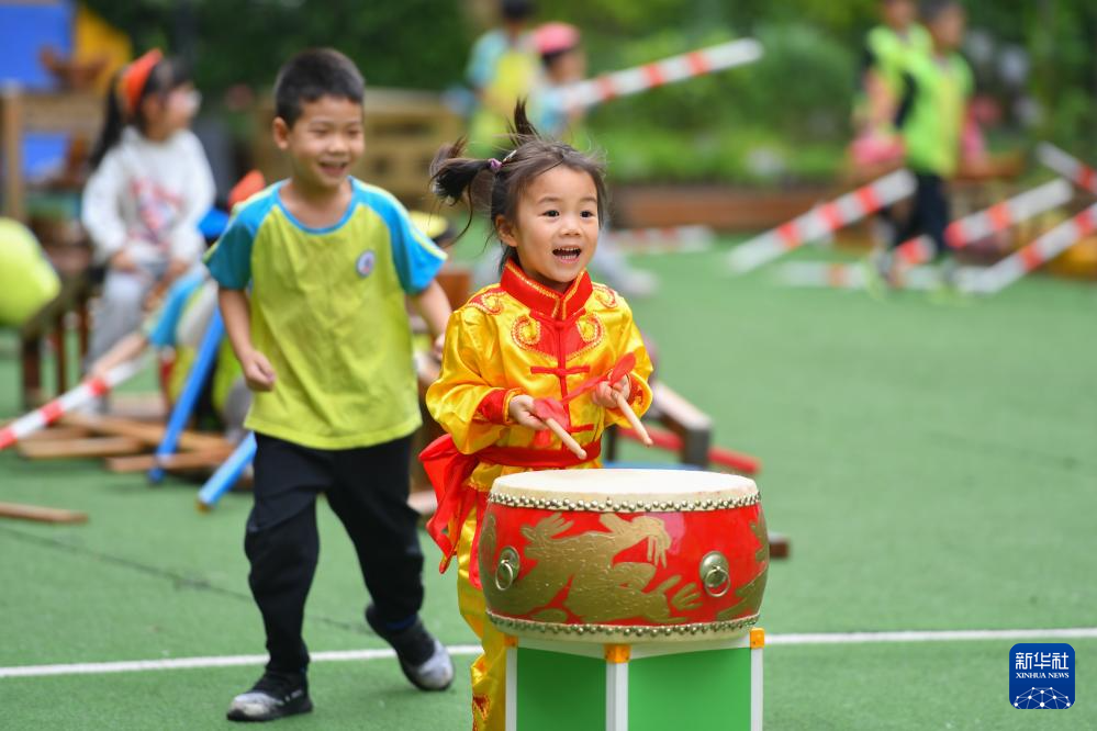 6月6日,在长沙市天心区教育局中建幼儿园“粽情欢畅 浓香端午”主题活动上,小朋友在“龙舟竞赛”中击鼓。