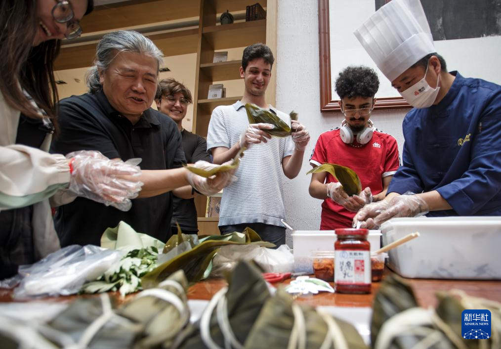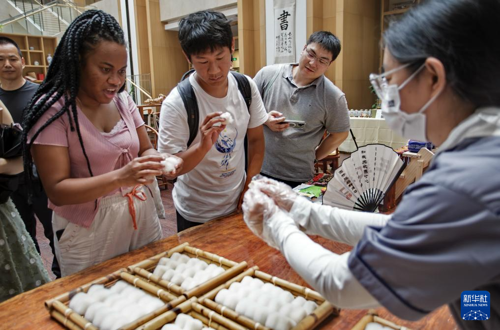 6月6日,“端午节以及2024文化和自然遗产日体验课”活动在北京对外经济贸易大学举行。这是留学生在学习包粽子。