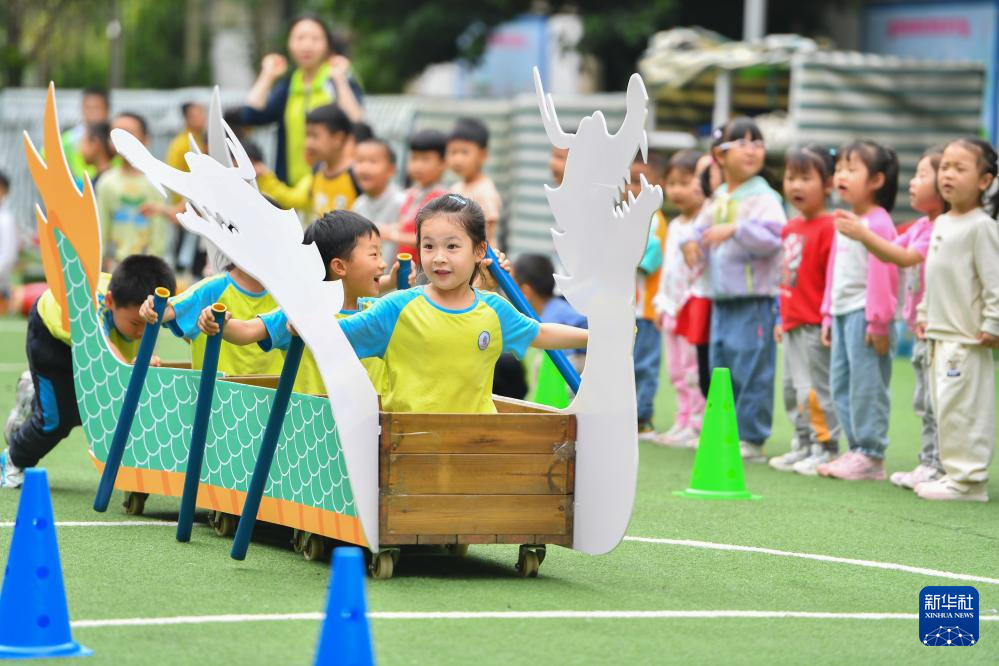6月6日,在长沙市天心区教育局中建幼儿园“粽情欢畅 浓香端午”主题活动上,小朋友们在进行“龙舟竞赛”。