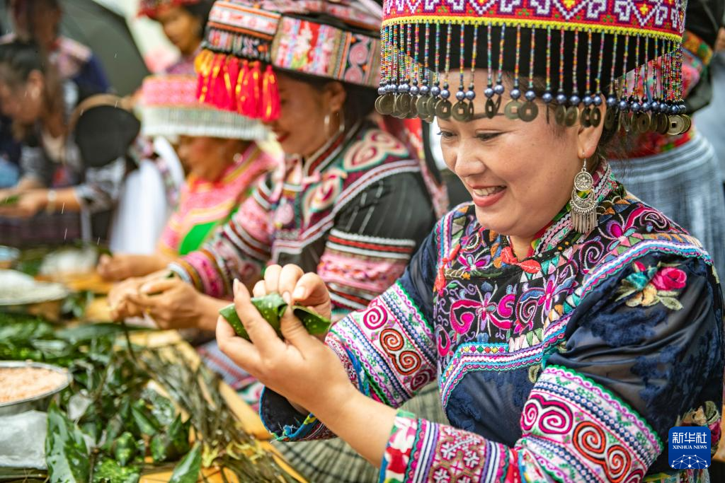 6月10日,云南省文山壮族苗族自治州文山市旧城村的苗族群众参加包粽子比赛。
