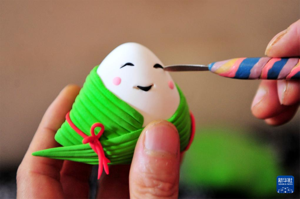 6月7日,在湖北省宜昌市夷陵区“端午文化月”系列民俗活动现场,民间艺人制作面塑粽子饰品。