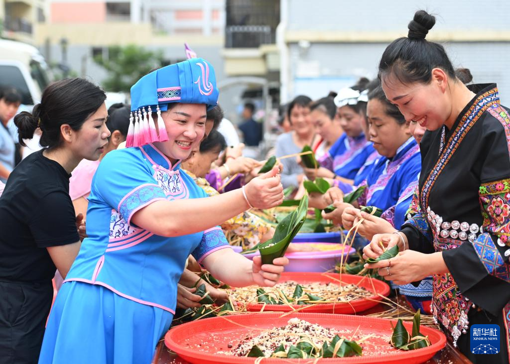 6月7日,在广西罗城仫佬族自治县易地搬迁安置区“仫佬家园”,搬迁群众在参加包粽子比赛。