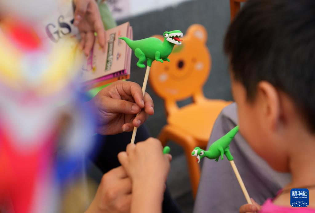 6月16日,小朋友在杭州桥西历史文化街区一处非遗体验点游玩。